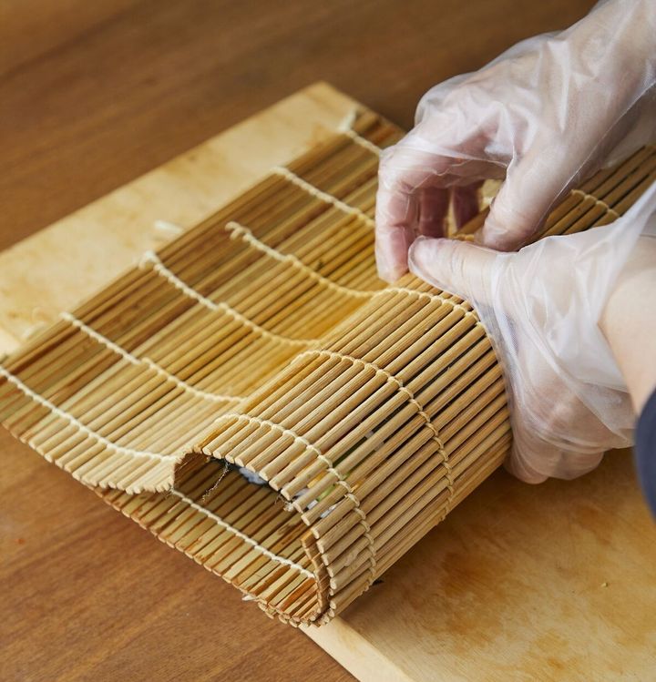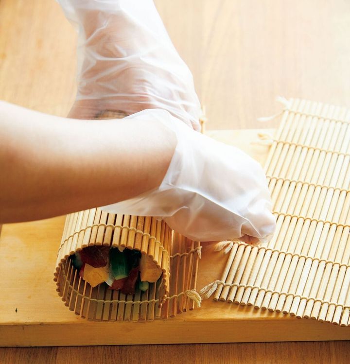 すしめしが手にくっつくときは、エンボスタイプの使い捨て手袋がおすすめ。 または、指先を手酢(水10:酢1程度の割合で混ぜる)でぬらすとすしめしが広げやすい。