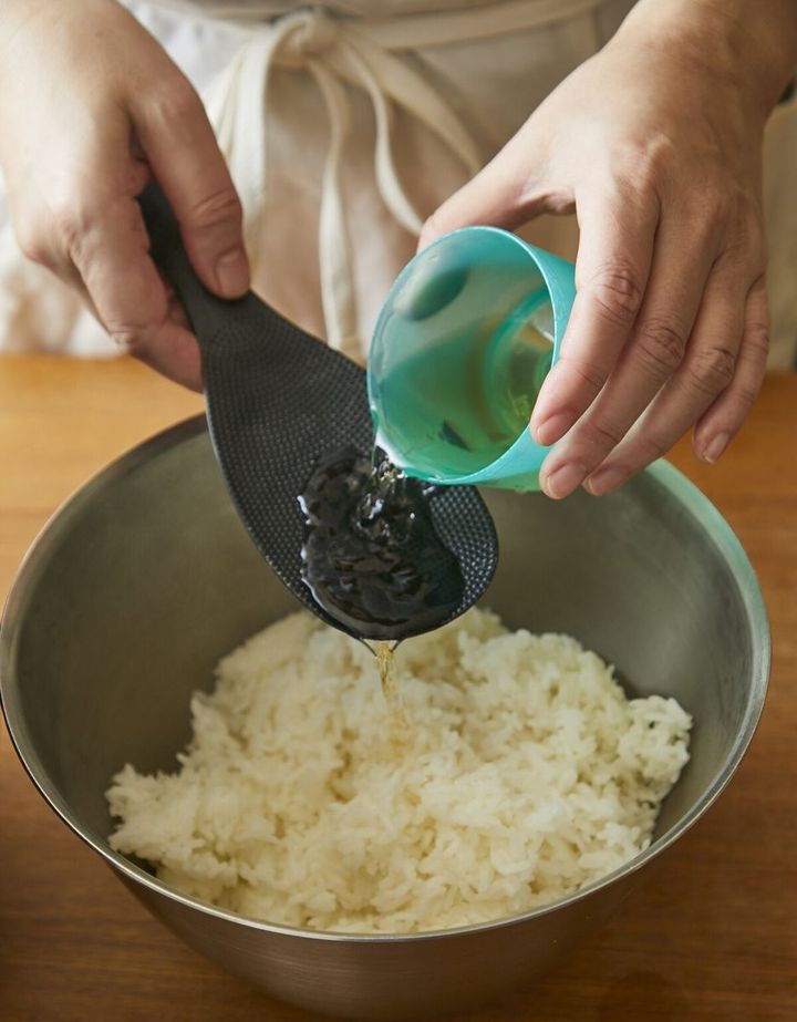「混ぜる」と「あおぐ」は同時に行わず、交互にすることで合わせ酢がしっかりとご飯にしみ込みます。