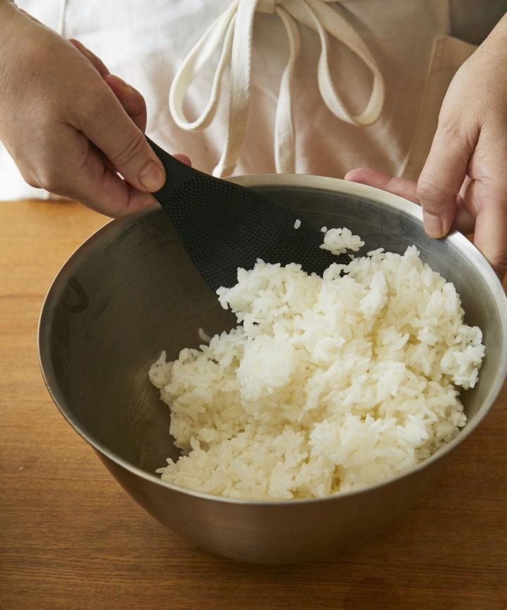 (2)しゃもじでご飯を切るように混ぜ、なじんだらうちわであおぐ。米粒の表面につやが出るまで、これを3~4回繰り返す。
