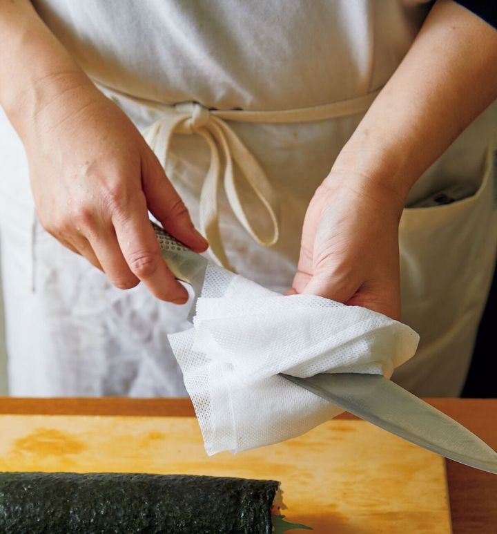 (1)包丁を水でぬらし、ふきんでかるく水けを拭く。切るごとにこれを繰り返す。