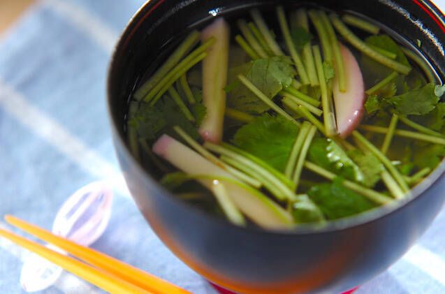 おせちのカマボコが少し残ったら作って欲しいミツバとカマボコのお吸い物です。ミツバは香りをいかすため、食べる直前に入れてください。