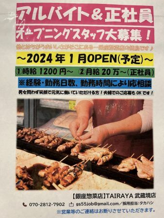 『銀座惣菜店』という炭火焼き鳥・鶏惣菜・お弁当の専門店が2024年1月に開店します。場所はたいらや武蔵境店敷地内、クリーニング店並び。関東4都県でチェーン展開するテイクアウト店で、都内では4店舗目。