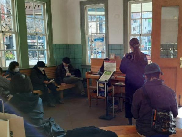 お昼時の旧駅舎にはどこからか人が集まってきていて、流れるような軽快な演奏に、終わると拍手が起きました。皆さんピアノの演奏を聴きながら、午後のひとときをゆったりと過ごしています。
