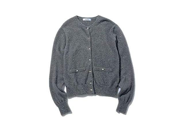 ミラー感をイイコなグレーがほどよく中和。ラメニットカーディガン¥14,300/マイストラーダ