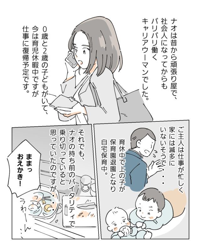 ナオは昔から頑張り屋で、社会人になってからもバリバリ働くキャリアウーマンでした。0歳と2歳の子どもがいて今は育児休暇中です。