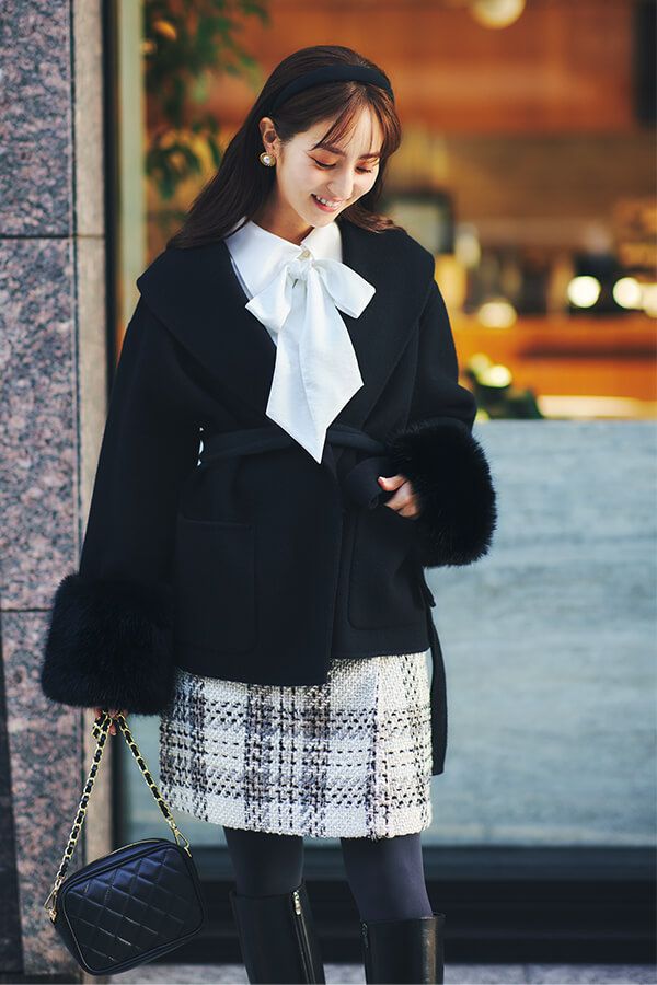 引き続きトレンドのクラシカルスタイルに合うアウターに迷ったら、ハーフ丈コートを選べば失敗しない! シンプルなデザインなら、ボウタイブラウスやツイード素材とも好相性。部分ファーがあると、さりげないリッチ&クラシカル感を保守してくれます。