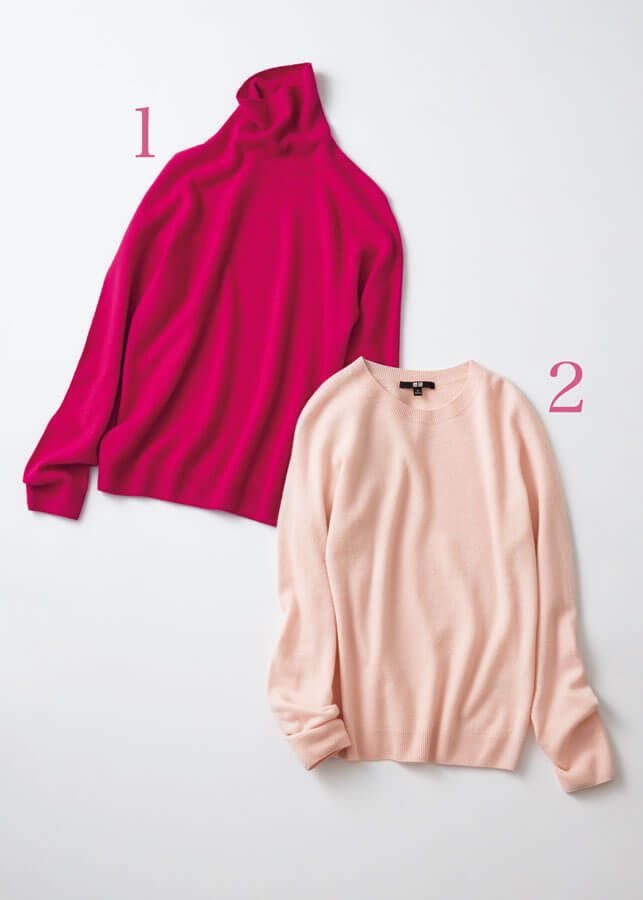 2.きれい色こそ上質素材でIN。チープに見えがちな淡ピンクもカシミヤならこの品格。柔らかなニットが極上の着心地を保証。