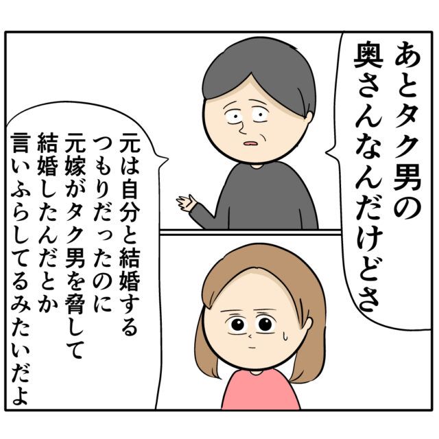 元は自分と結婚するつもりだったのに、元嫁がタク男を脅して結婚したんだ、とか・・言いふらしてるみたいだよ」