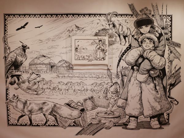 そのメインの催しである「大乙嫁語り展」は、19世紀半ば、中央アジアを旅するイギリス人旅行者スミスが各地で出会った“乙嫁”(美しいお嫁さん)たちを描いた漫画『乙嫁語り』の原画展。作者である森薫先生直筆のカラー、モノクロ原稿を中心に、100点以上のボリュームで展示されています。迫力の生原画を通して、壮大な乙嫁の世界をじっくりと楽しめる見ごたえある展覧会です。森薫先生の肉筆イラストを通じて、スミス一行や、アミルら乙嫁たちの軌跡と中央アジアの空気を、ぜひ会場で体感してみてください。