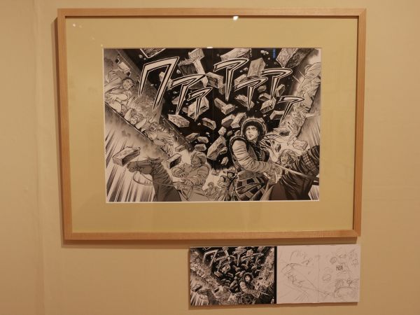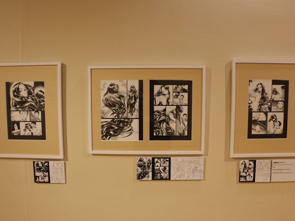また、原画の下には同じシーンの小さなパネルが2種類並んでいます。これは、“ネーム”と“印刷されたもの”で、原稿が中間制作物なら、いわば“ラフ案”と“完成品”。今までいくつか原画展を見たことがありますが、この3つが並んで同時に見ることができる展覧会は、あまりなかったように思います。そんな貴重な展示に感動していると、「注目してほしいのが目の表現です。森先生の絵は、目で感情を伝えるパワーがあるんです」