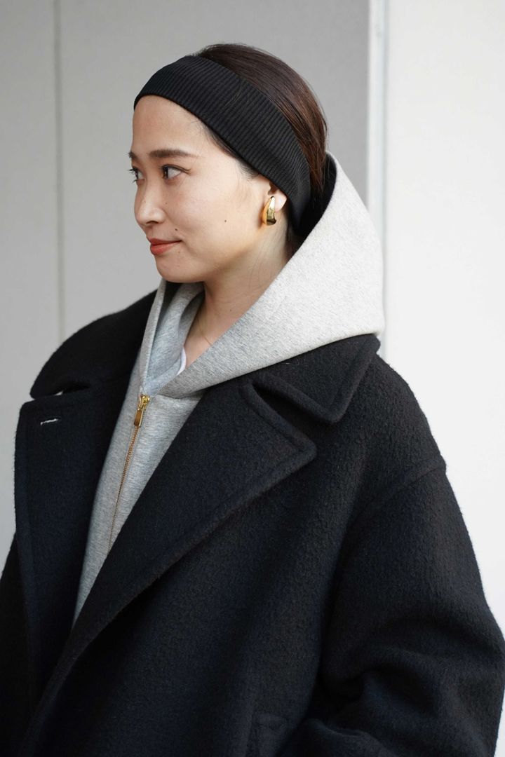 「上質素材のブラックコートに、パーカとヘアバンドを合わせてスポーティMIXな着こなしにしてみました。ベーシックなジャケットやコートにレイヤードするだけで今の気分の着こなしにしてくれるパーカがお気に入りアイテムです。ゴールドジュエリーやレザー小物でモダンなムードも忘れずに」