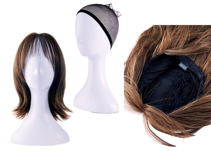 ウィッグの内側が帽子になっているので締め付け感なし。髪が長い人は付属のネットで髪をまとめてから被ればOK。帽子ウィッグ外ハネボブ耐熱ダークブラウン¥8,140(PRISILA)