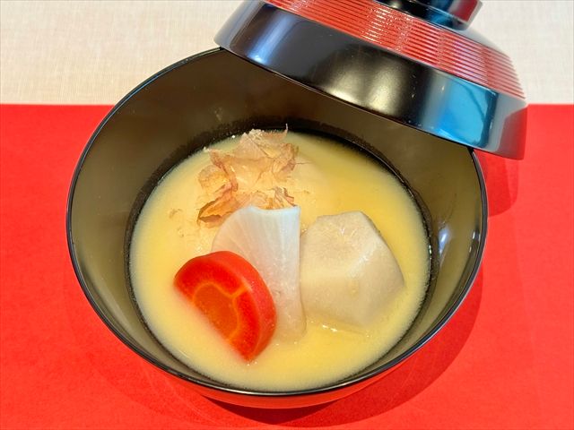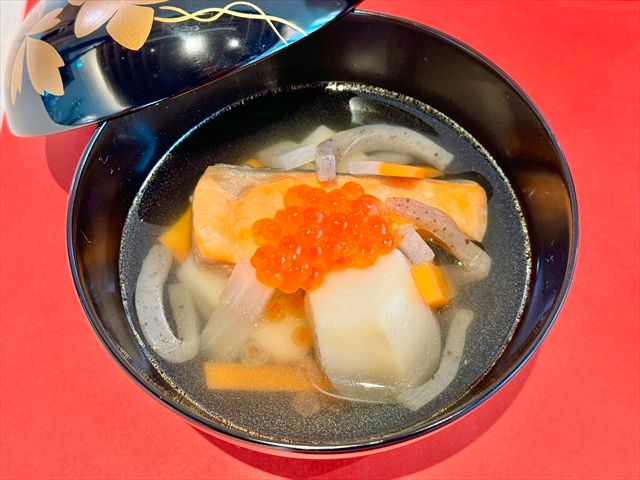 西日本・博多雑煮の鰤に対し、東日本の新潟では縁起魚とされる鮭が入っています。細く長く、長寿の願いを込めたかんぴょう、鮭、イクラが入った豪華で華やかなお雑煮。具材の魚から出るだしがよい仕事をしている、魚介の旨みを感じる味わいです。