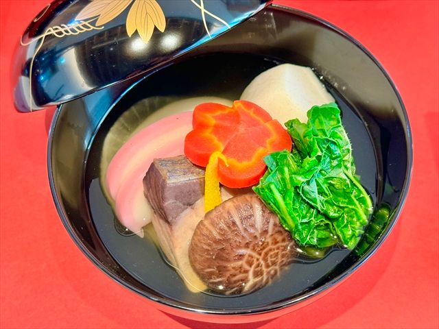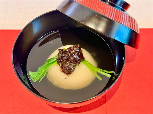 今回ビジュアルを見て、最も驚いたのが出雲雑煮でした。とても洗練された見た目が印象的! 餅の上にのっているのは、十六島(うっぷるい)海苔で、島根県出雲市十六島周辺で獲れる岩海苔。奈良・平安時代より献納品とされ、希少で高級なものなので、新年のお雑煮に入れていただくのにピッタリな食材です。