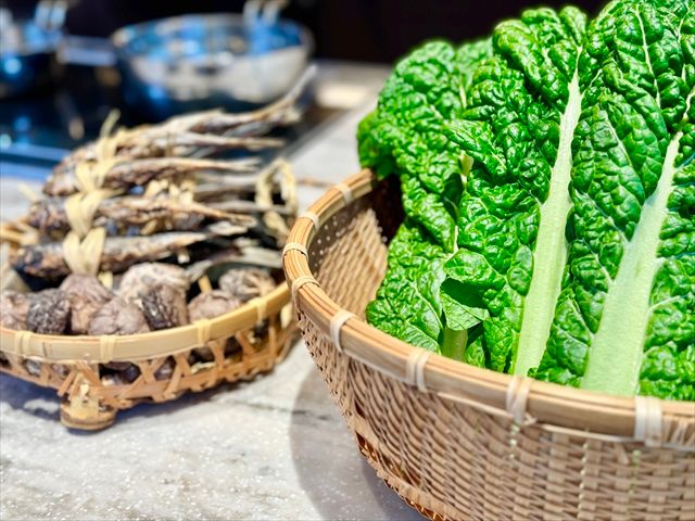 お雑煮のだしに欠かせないものだったという「あごだし」。具材は、鰤(ブリ)、かつお菜、干し椎茸など。食べ比べでいただいたものは、鶏肉も入っていて食べ応えあり。古くから福岡で栽培されてきた食材・かつお菜は、ほんのり苦みを感じるアブラナ科の葉野菜です。