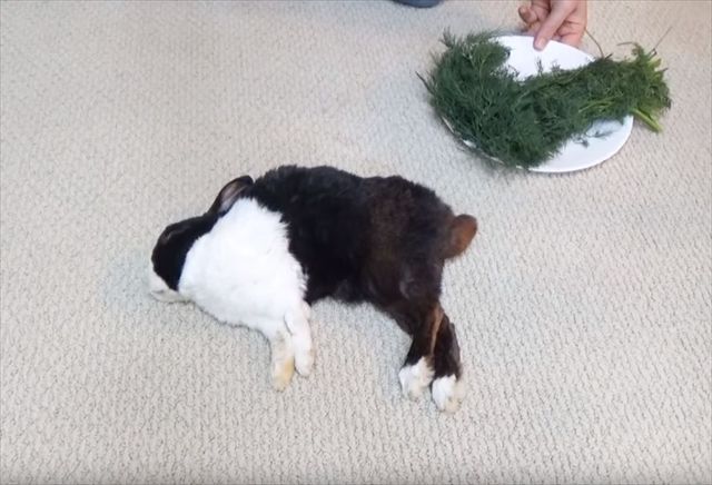 3. ぐっすり眠っているウサギをご飯で囲んでみた!起きた瞬間のリアクションが微笑ましくて癒される