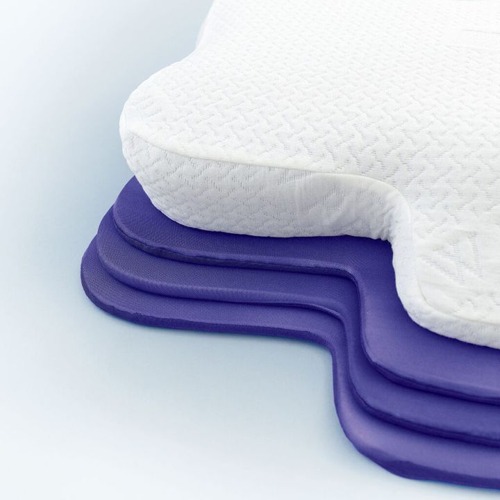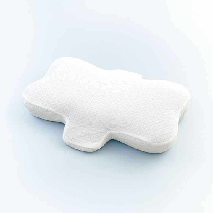 脊椎が正しいアーチを描くよう設計された枕。低、高反発の中間である相反発という独自素材。「まずは形が個性的! でもこの少し飛び出した部分が、首と肩を支えてくれるんです。しかも、上下の突起で硬さが違って、体の調子に合わせて好きなほうを選べる。あとは、付属のパッドを入れ込むことで、高さをカスタマイズできるのですが、買ったあとでベストな高さに調節できるってかなり高ポイント。横幅も広いので、寝返りが打ちやすいし、横向き寝もしやすかった。ふだんの枕ではたまに、朝起きて首と肩が痛い……と感じることがあるのですが、そんなこともなく、快適に眠れました」