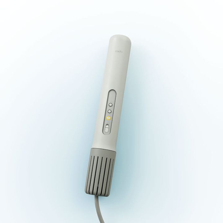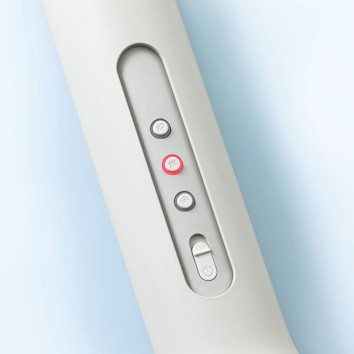 ワンタッチで、筒の先から55℃の温風が出てくる仕様。「ふとん乾燥機でスティック型、しかもこのサイズ感ということにまず惹かれますよね。ふだんはベッドサイドに置いておけて、使うときだけ、さっと取り出して使えるコンパクトさはかなり魅力的ですね。激しいモーター音もせず、夜でも気兼ねなく使えます。寝る前に歯磨きをしながら、10分間のあたためモードを試して、そのままふとんに入ったらほんのり暖かくて心地よかった。冬の分厚い毛布も加わると、10分では少し物足りない印象でしたが、乾燥60分間なら十分。冬は特に毎日のように使う習慣がつきそうです」