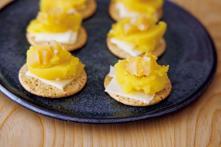 栗きんとん50gと栗1粒を取り分け、栗は5mm角に切る。バター10gは薄切りにする。クラッカー6枚にバター、栗きんとんを等分にのせ、刻んだ栗を散らす。