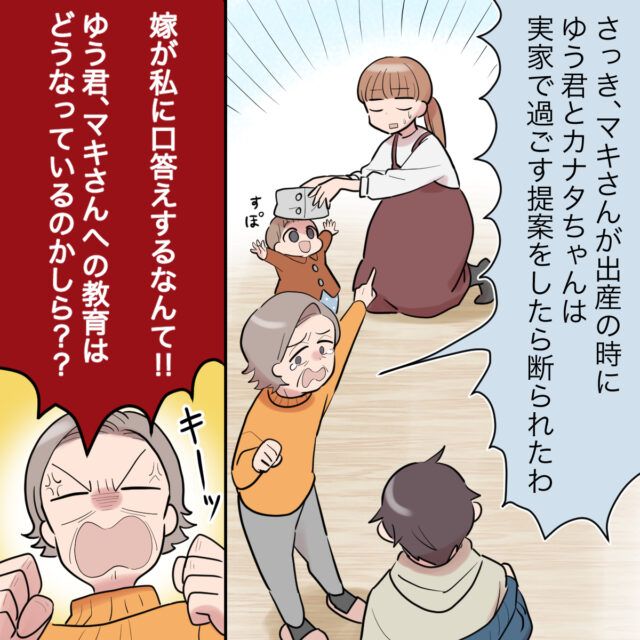 義母に、夫を支える「妻の努め」と、子供をしっかり育てる「母親の努め」ができていないと言われてしまったマキさん。更に義母は、マキさんが二人目の子の出産時はゆうさんと孫のカナタくんを義母の家で過ごしてもらうと言い出しました。