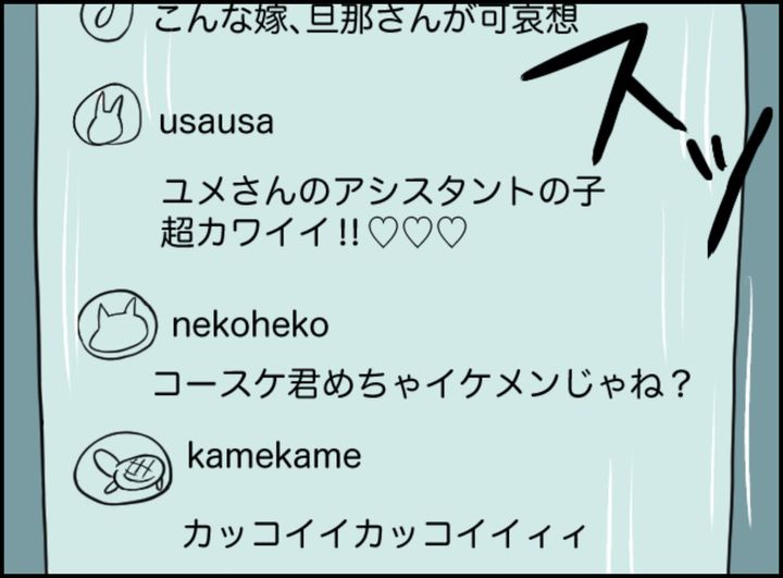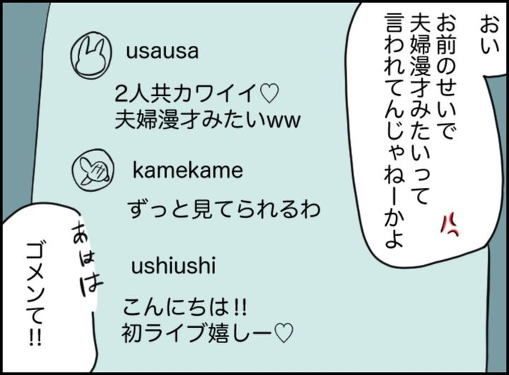 悪質コメントを見てしまうのでは?とヒヤヒヤしていた、コースケ。しかし、ちょうど他の人たちのコメントが次々に流れてきたため、ユメさんには、ギリギリ見えずに済んだようです。