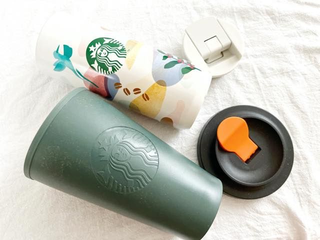 お次はタンブラーをご紹介。上は二重構造のステンテスタンブラー(355ml)、下はライスハスクタンブラー(458ml)です。白いタンブラーはスタバのドリンクのショートサイズまで、緑のはトールサイズまで入ります。スタバのタンブラーといえば、店頭などで購入すると、一杯無料のドリンクチケットがついてきますが、さすがにありませんでした(笑)。
