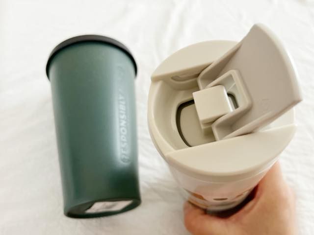 今まで見たことないタイプのタンブラーでしたが、フタが独特なデザインでした。飲み口の部分がかなり狭いので、カプチーノやフラペチーノは正直不向きそう。ドリップコーヒーやティー系なら問題なさそうです。しいて言うならば、フタの開け閉めが固めなのが難点かも。
