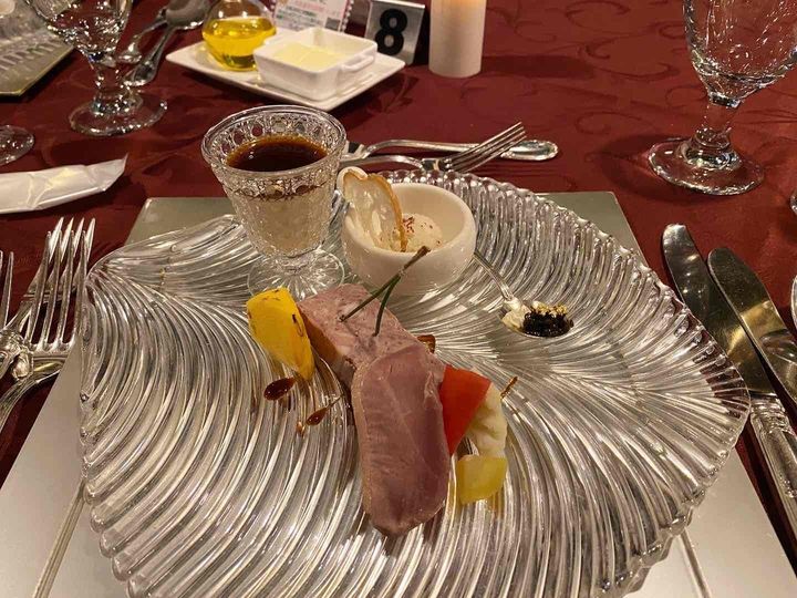 この夜、シンフォニークルーズでいただいたのはフレンチのディナーコース「シンフォニーロワイヤル」。窓際指定席で1人25,000円(クルーズ参加費込み)。季節によってコース料理の内容が変化します。