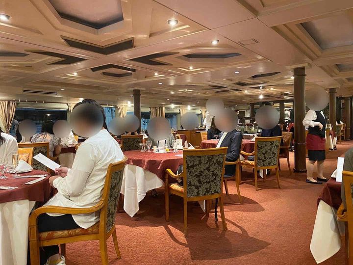 船に乗り込んだら、まずはディナー会場である、船内の各レストランへと向かいます。入り口で名前を伝えると、丁寧に席まで案内していただけました。