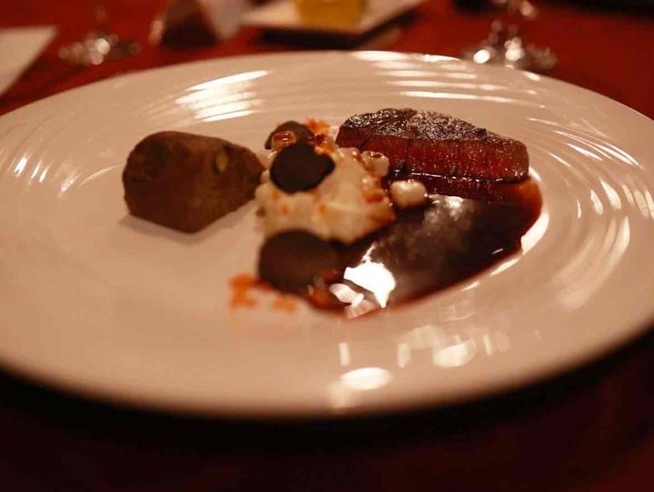 アミューズとして「月替わりの前菜の盛り合わせ」から始まり、「エスカルゴとベーコンのフリカッセ クレソニエール」「鮮魚のヴァプール 生ノリのブイヨン」「牛肉のポワレと鹿肉のマーブル仕立て」とパン、最後にはデザートとコーヒーまたは紅茶がついてくる大満足のコースでした。
