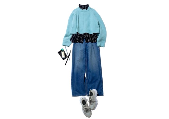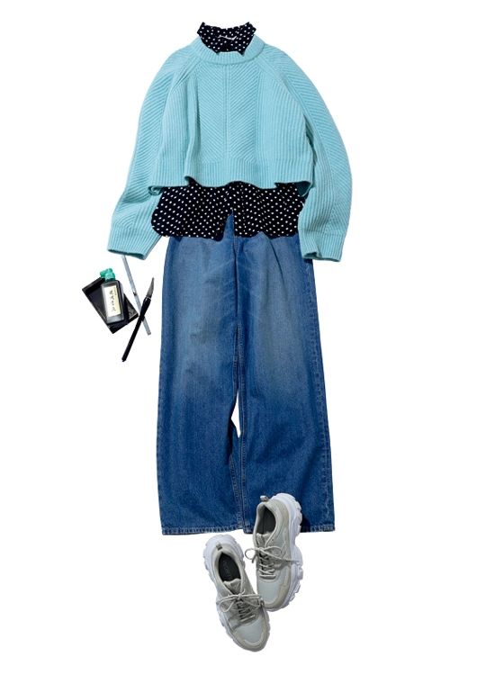 ニットセットプルオーバー(ニット)¥15,400/ミラ オーウェン ルミネ新宿2店、デニムパンツ¥8,910/ギャレスト(ワールド)、水玉ブラウス¥6,590/ZARA(ザラ)、スニーカー¥8,800/ORTR( ダブルエー)