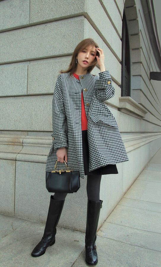 Aラインのチェックコートで、印象をパリテイストに引き寄せれば、ミニスカの品格が上昇。
