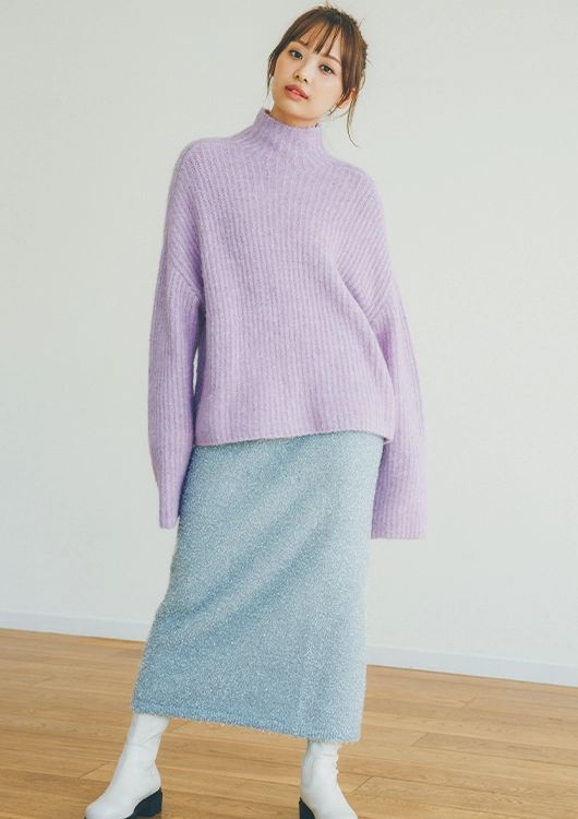 ラベンダーニット¥14,960/ミラオーウェンルミネ新宿2店 グリッタータイトスカート¥23,100/アルページュストーリー ブーツ¥27,500/ダイアナ(ダイアナ 銀座本店)