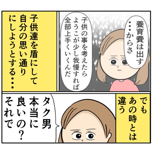 タク男さんの両親から、最近奥さんとあまりうまくいっておらず、タク男さんの足取りを確かめるためにようこさんの家にやって来た可能性があると言われたようこさん、その数ヶ月後、子ども達に会いに来たタク男さんに「もう一度家族としてやり直したい」とあり得ない言葉が・・