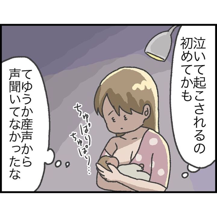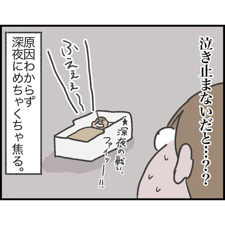 母子同室になって初めての夜。しおさんは夜間の3時間おきの授乳に臨みました。しかし、母乳をあげても一向に泣き止まない赤ちゃん…。しおさんはどうしたらいいのか分からず焦ってしまいました。