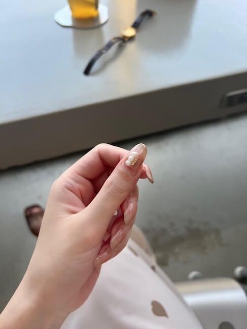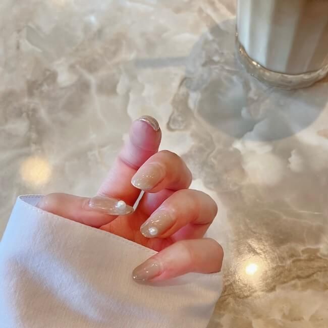 まず1つ目は、ちょこんとのせたトレンドのパールが可愛いネイルデザイン。