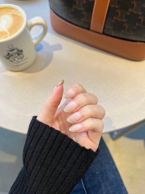 3つ目は、ゴールドの細フレンチラインにさりげなくストーンをのせたネイルデザイン。