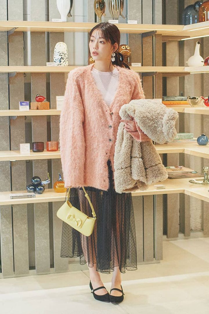 トップスは着回し。ボアハーフコート 25,300円/レイ ビームス(レイ ビームス 新宿) 起毛カーディガン 6,490円/w closet(WEARS INC.) ドットチュールスカート 9,200円/Treat Ürself イヤリング 2,530円/アネモネ(サンポークリエイト) バッグ 6,990円/MANGO(LOCONDO) パンプス 15,950円/ダイアナ(ダイアナ 銀座本店)