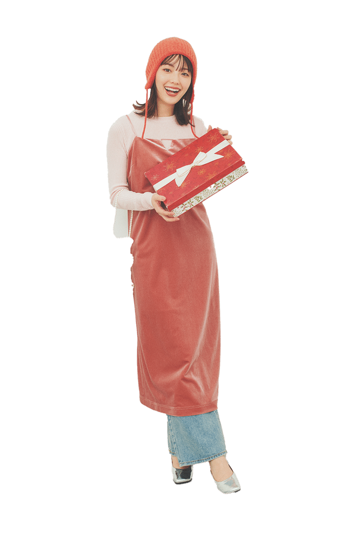 トップスは着回し。デニムパンツ 14,300円/ACYM ベロアキャミワンピース 10,780円/LILLIAN CARAT(リリアン カラット) ニット帽 8,800円/OVERRIDE(OVERRIDE 神宮前店) バッグ 9,900円/キャセリーニ パンプス 17,600円/piu comoda(ROSE BUD ルミネエスト新宿店)