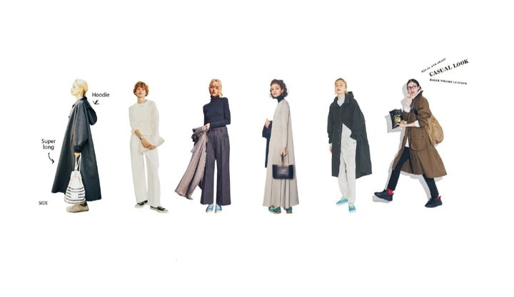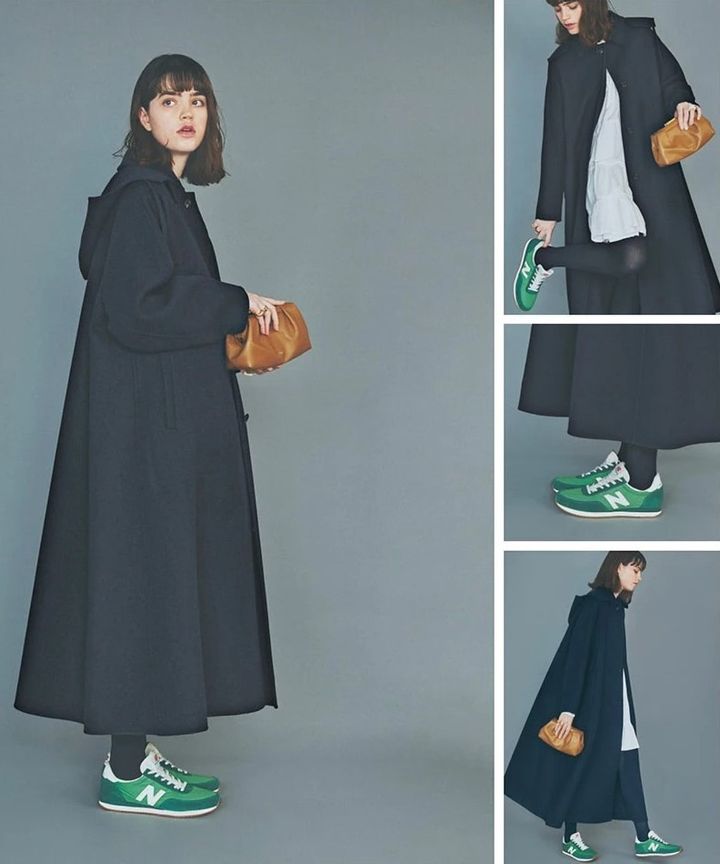 「ある意味スタイリングいらずともいえる、全身を包み込むオーバーサイズのロングコート。スニーカーと相性がいいのは、ヒザ上より短めのボトムか、長い羽織りアイテム。タイツの色みもそろえ、色もフォルムも重いトーンに徹すればだいたいのスニーカーはバランスよく仕上がります」(樋口さん)