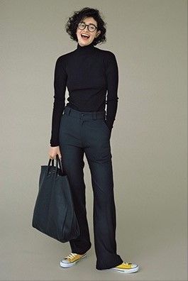 「キレイめ&シンプルなニット+パンツの黒ワントーンをローテクスニーカーでくずす。定番的な合わせにイエローで遊び心を」(樋口さん)
