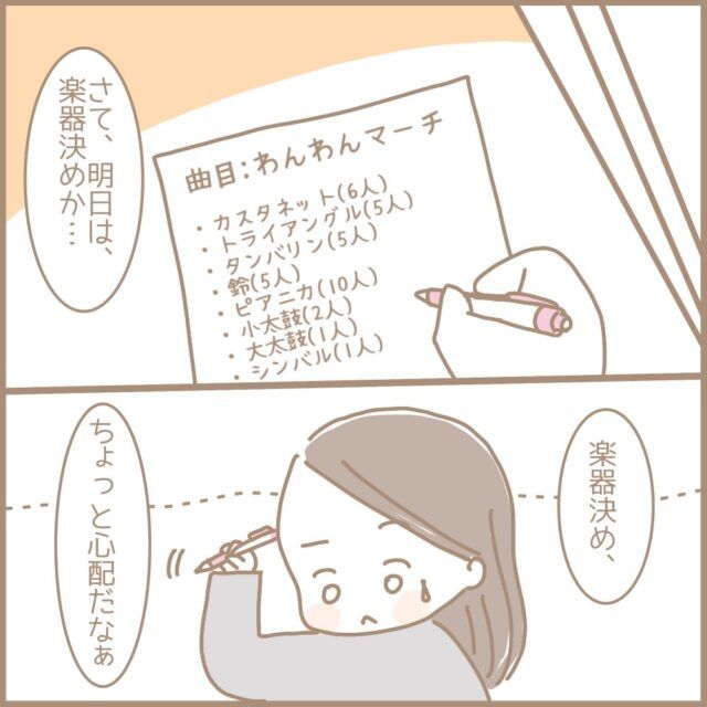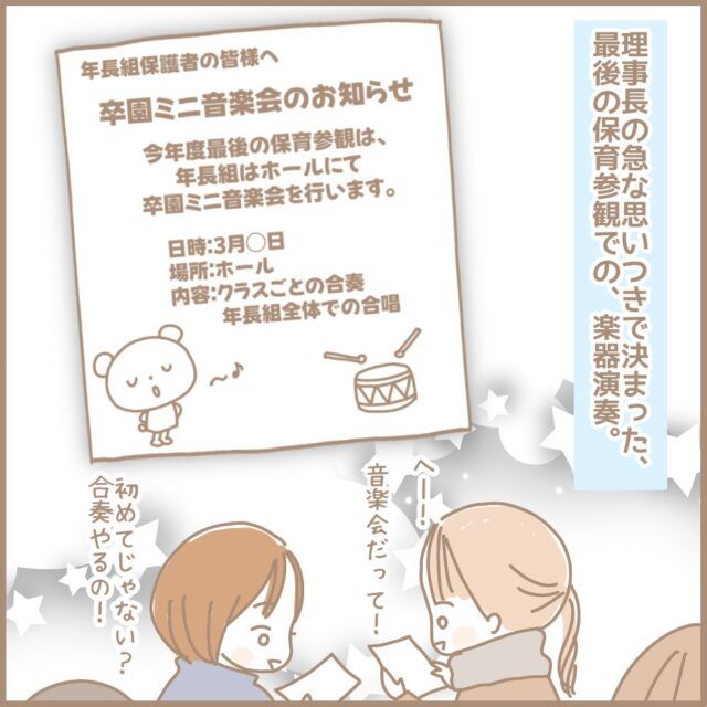 3月初めに行われる最後の保育参観は制作活動後に歌を披露するのが毎年の恒例でしたが、理事長が「他の園で観て素晴らしかったから楽器演奏を取り入れたい」と言い出して急遽変更されることに!忙しい中どう準備すればよいかと頭を悩ませるまるちゃんさんたちなのでした・・。