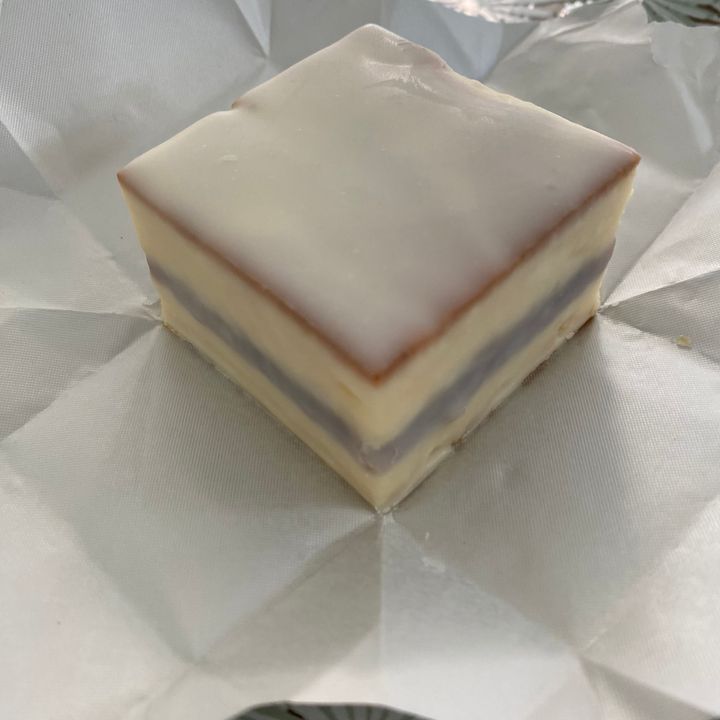 カステラの生地の部分はほのかな甘みとしっとりした食感で、コーティングのホワイトチョコともよく合います。