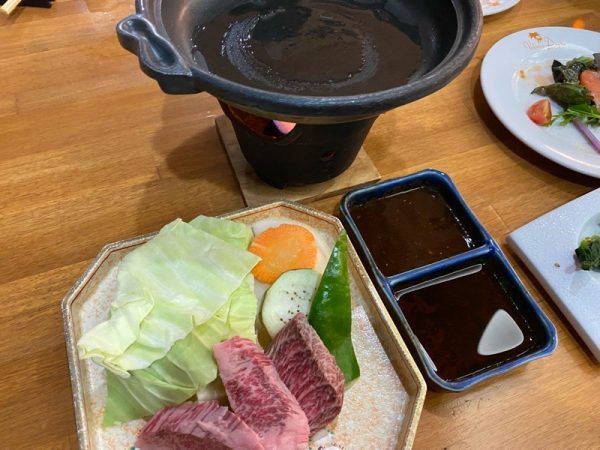 和牛とお野菜の陶板焼きです。熱々をいただきます。