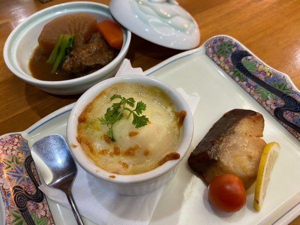 お魚の照り焼きと牡蠣のグラタン、そして豚の角煮。この辺りで、そろそろお腹に余裕がなくなりつつあります。