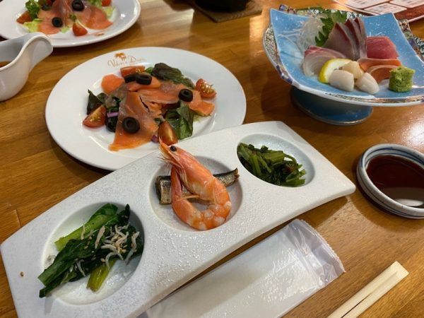 テーブルに並んでいるのは、前菜、お造り、サーモンサラダ。お造りは5種類のお魚が盛られていました。サーモンサラダには、地元の柑橘系の手作りドレッシングでいただきます。