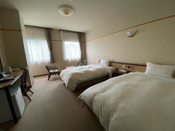 3階山側のツインルーム。27平米で大きめのベッドが2台並んでいて広々!ゆったりと過ごせました。一番端のお部屋だったので、海も見えて景色も楽しめました。 ただ、鍵がカード式でなく、一部屋に一つの鍵でした。