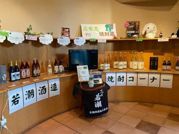 お腹いっぱいになって、腹ごなしに売店を散策しました。志布志市の蔵元「若潮酒造」の焼酎コーナーもありました。フロントの方にお声掛けすると、試飲も出来るそうです。