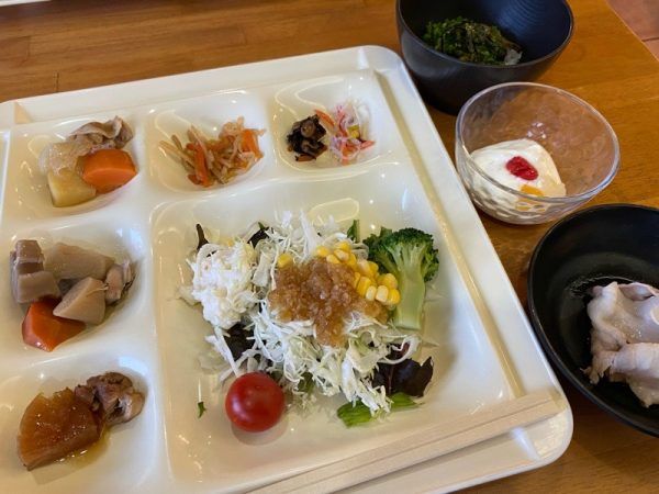 焼き魚、キンピラ、ひじき煮、切り干し大根、紅白なます、納豆などの和朝食の定番をいただけます。