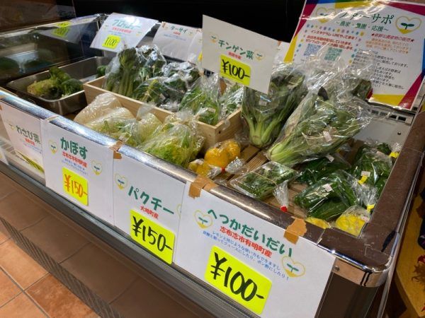 地元でとれた、新鮮なお野菜も販売されていました。「ターサイ」「辺塚だいだい」など、地域ならではの物もありました。
